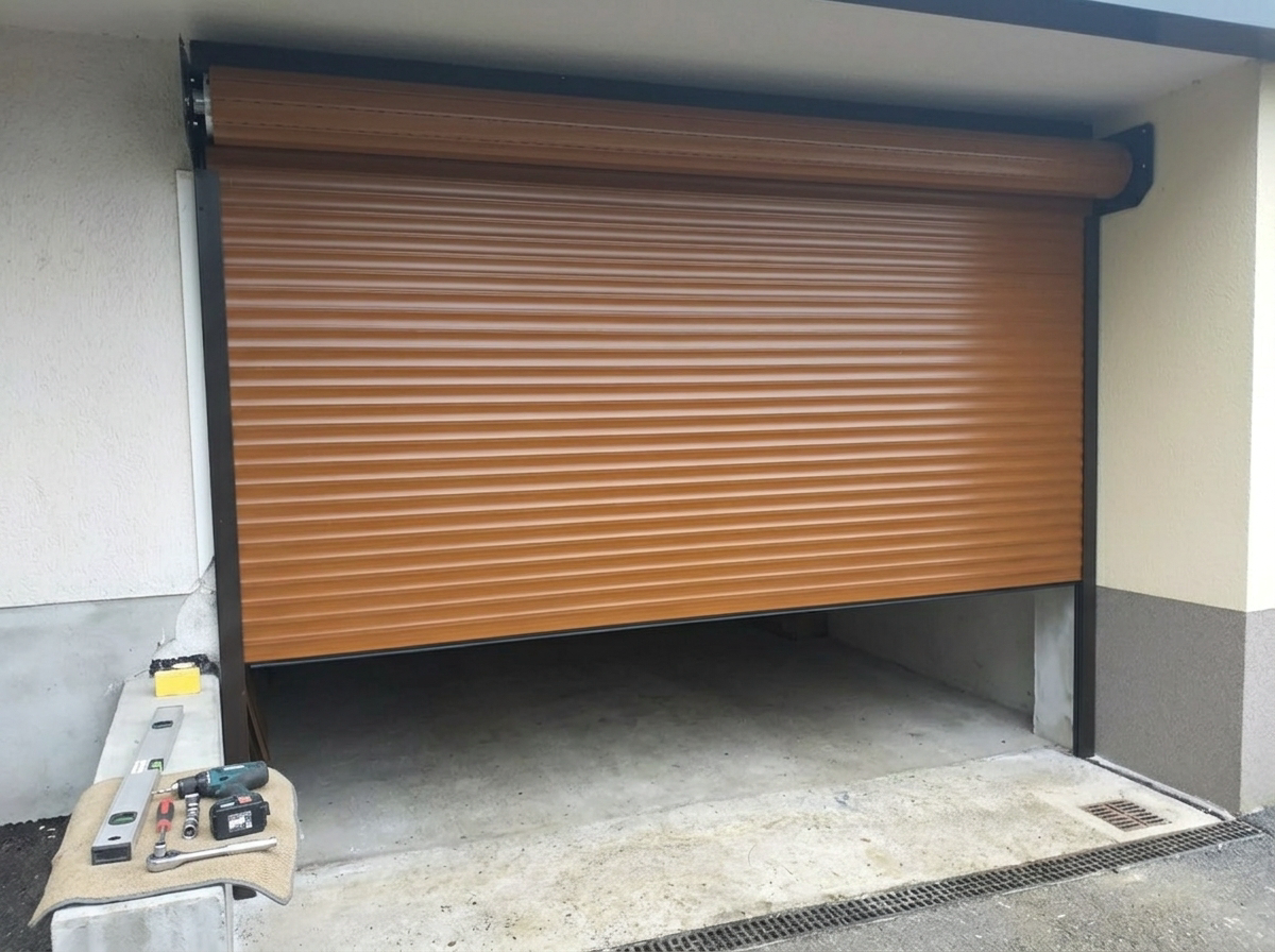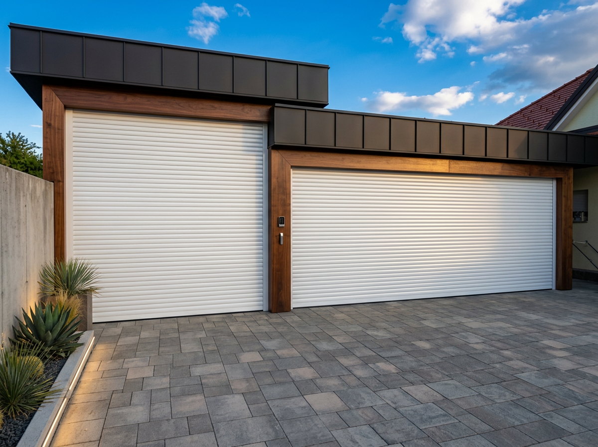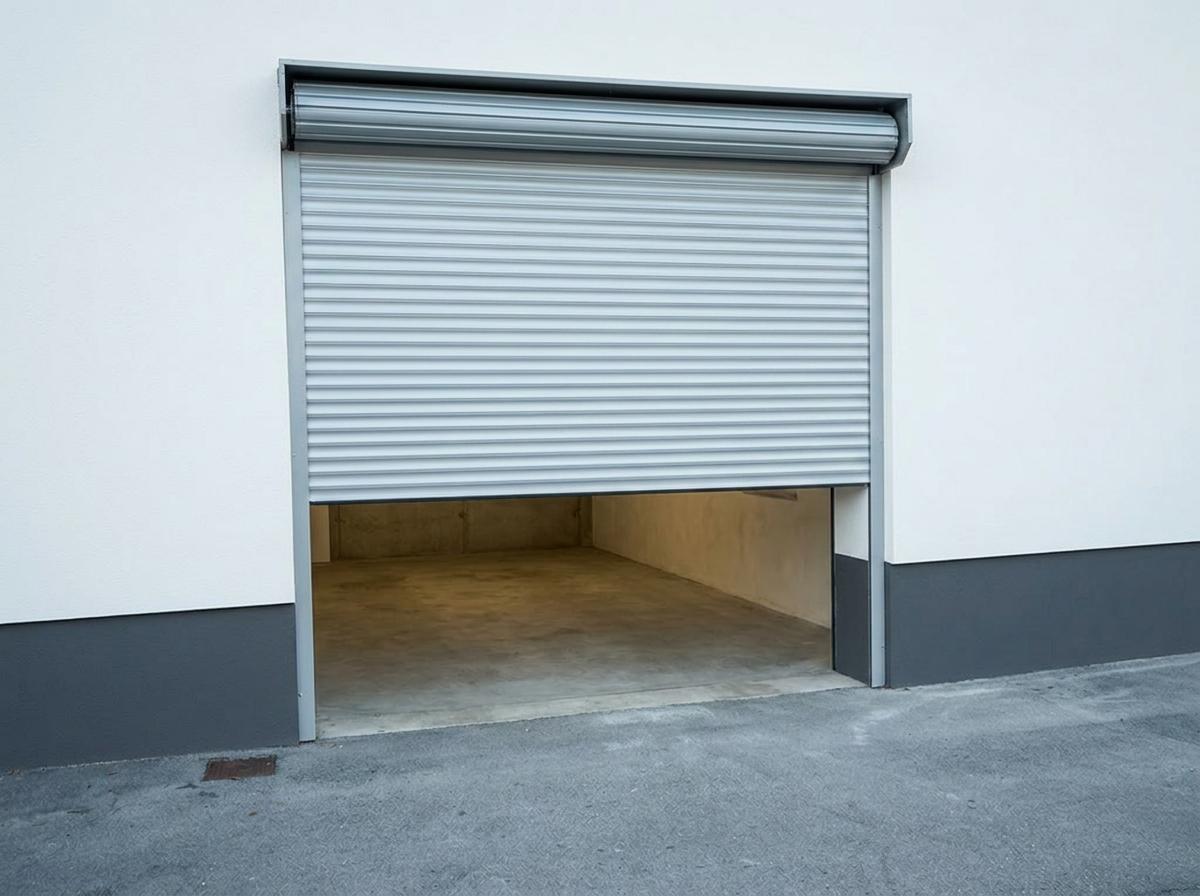 Rolo garažna vrata se odpirajo navpično in se navijajo v kompaktno omarico nad odprtino.